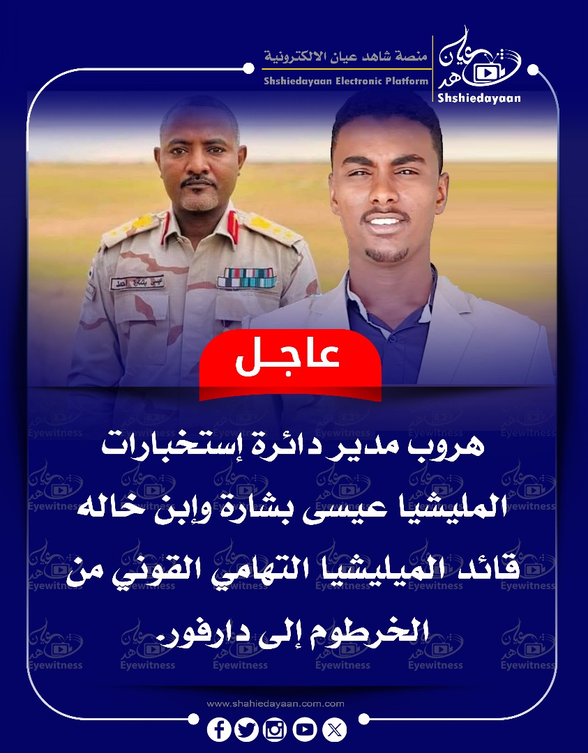 خبر في صورة الأخبار عاجل …. هروب مدير دائرة إستخبارات یان المليشيا عيسى بشارة وابن خاله قائد الميليشيا التهامي القوني من الخرطوم الى دارفور شاهد عيان يناير 25, 2025 0 أقرأ المزيد ..