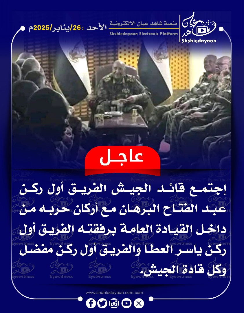 خبر في صورة الأخبار إجتمع قائد الجيش الفريق أول ركن عبد الفتاح البرهان مع أركان حربه من داخل القيادة العامة شاهد عيان يناير 26, 2025 0 أقرأ المزيد ..