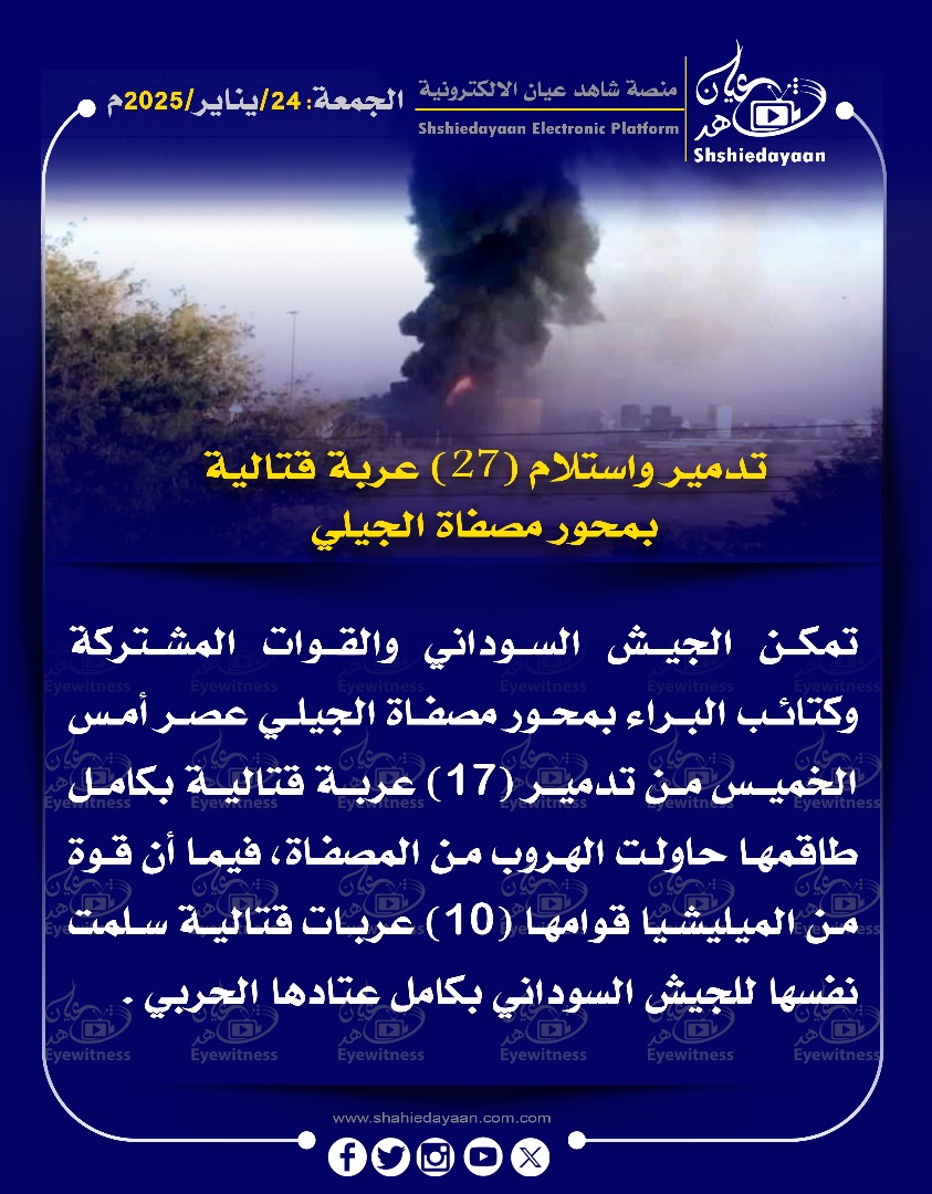 خبر في صورة الأخبار تدمير واستلام (27) عربة قتالية بمحور مصفاة الجيلي شاهد عيان يناير 24, 2025 0 أقرأ المزيد ..