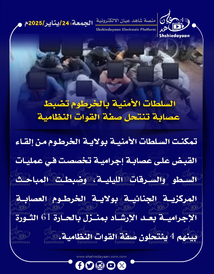 خبر في صورة الأخبار السلطات الأمنية بالخرطوم تضبط عصابة تنتحل صفة القوات النظامية شاهد عيان يناير 24, 2025 0 أقرأ المزيد ..