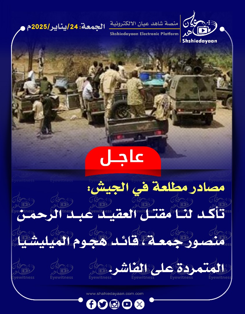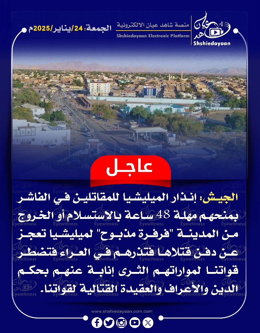 خبر في صورة الأخبار عاجل ….. الجيش: إنذار الميليشيا للمقاتلين في الفاشر بمنحهم مهلة 48 ساعة بالاستسلام أو الخروج من المدينة “فرفرة “مذبوح شاهد عيان يناير 24, 2025 0 أقرأ المزيد ..