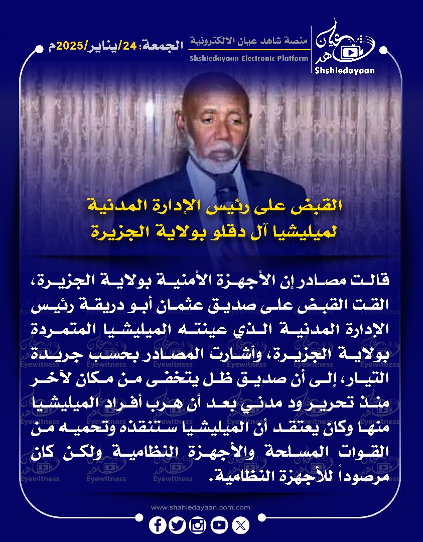 خبر في صورة الأخبار القبض على رئيس الإدارة المدنية لميليشيا آل دقلو بولاية الجزيرة شاهد عيان يناير 24, 2025 0 أقرأ المزيد ..
