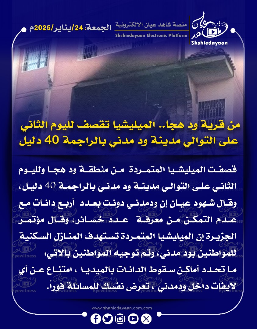 خبر في صورة الأخبار من قرية ود هجا.. الميليشيا تقصف لليوم الثاني على التوالي مدينة ود مدني بالراجمة 40 دليل شاهد عيان يناير 24, 2025 0 أقرأ المزيد ..