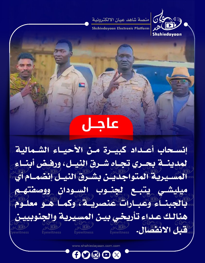 خبر في صورة الأخبار أعداد كبيرة من الأحياء الشمالية المدينة بحري تجاه شرق النيل، ورفض أبناء المسيرية المتواجدين بشرق النيل إنضمام أي ميليشي يتبع لجنوب السودان شاهد عيان يناير 23, 2025 0 أقرأ المزيد ..