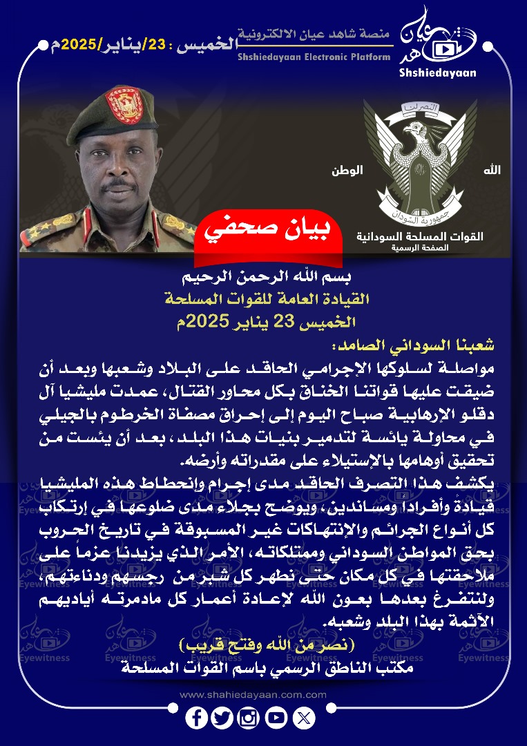 خبر في صورة الأخبار القيادة العامة للقوات المسلحة بيان صحفي الخميس 23 يناير 2025م شاهد عيان يناير 23, 2025 0 أقرأ المزيد ..