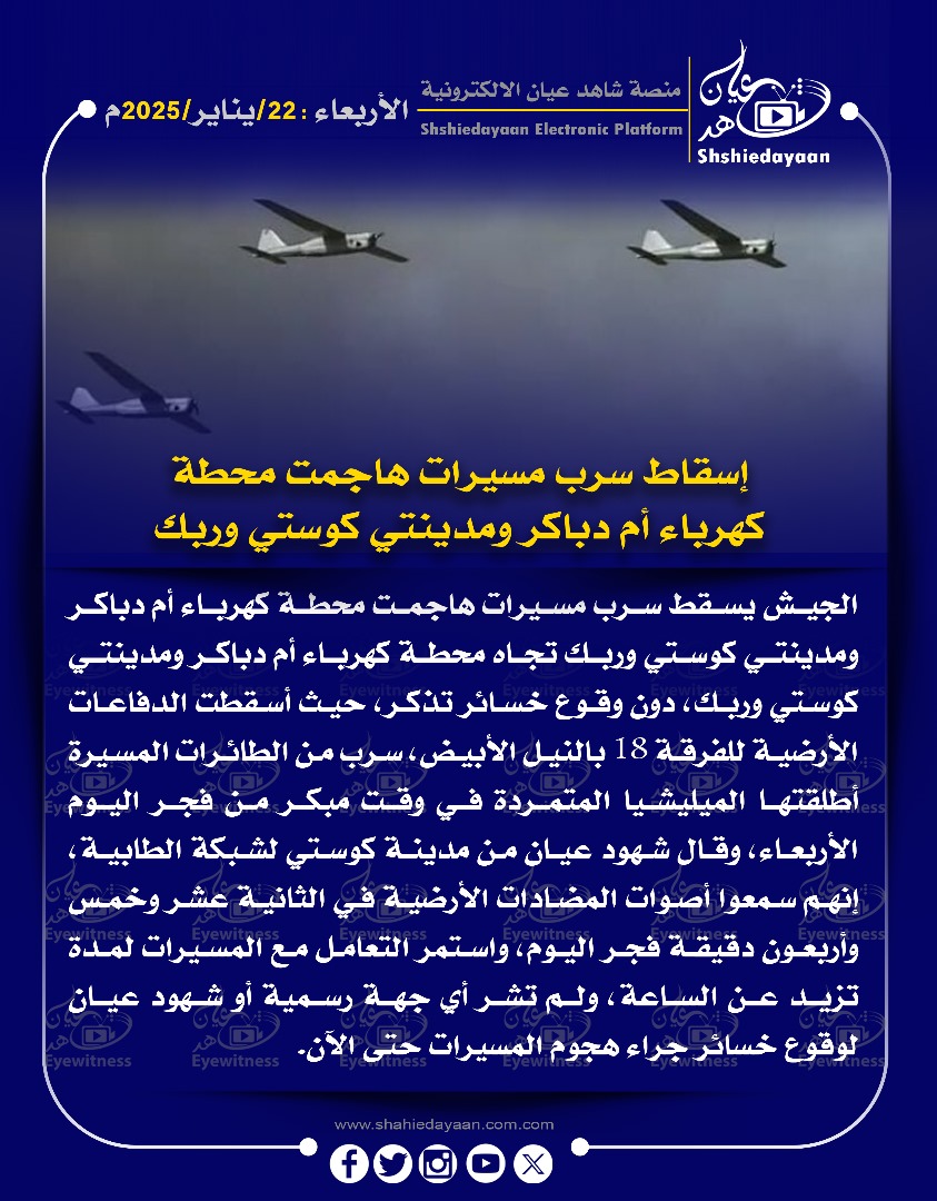 خبر في صورة الأخبار إسقاط سرب مسيرات هاجمت محطة كهرباء أم دباكر ومدينتي كوستي وربك شاهد عيان يناير 22, 2025 0 أقرأ المزيد ..