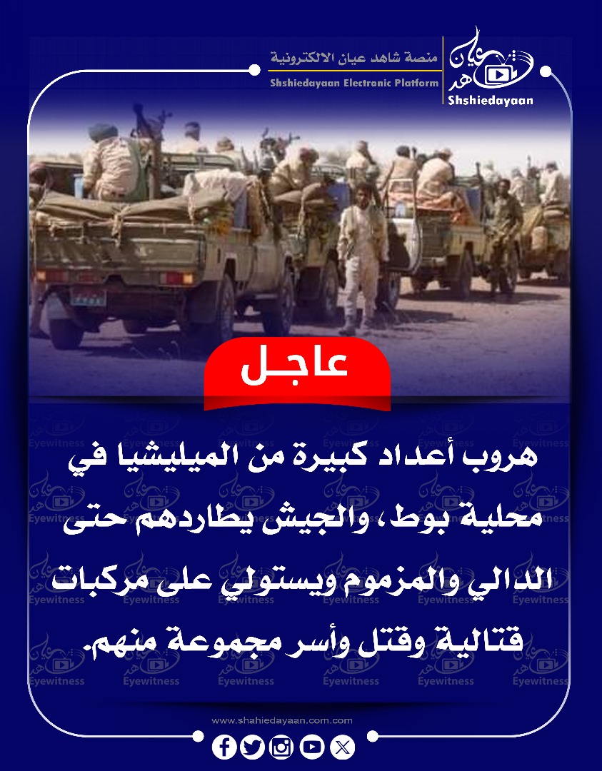 خبر في صورة الأخبار عاجل … هروب أعداد كبيرة من الميليشيا في محلية بوط شاهد عيان يناير 22, 2025 0 أقرأ المزيد ..