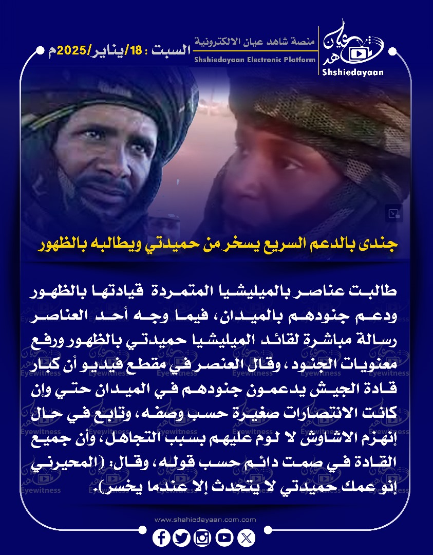 خبر في صورة الأخبار جندى بالدعم السريع يسخر من حميدتي ويطالبه بالظهور شاهد عيان يناير 18, 2025 0 أقرأ المزيد ..