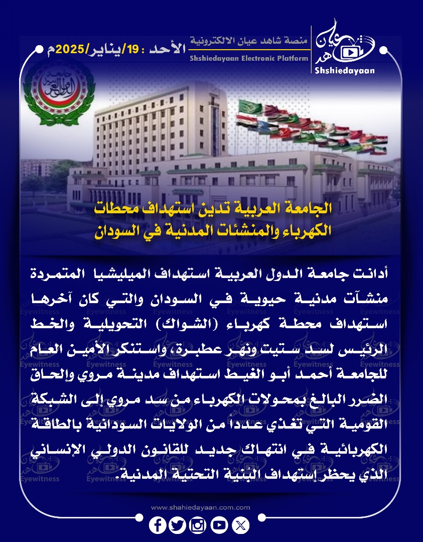 خبر في صورة الأخبار الجامعة العربية تدين استهداف محطات . الكهرباء والمنشئات المدنية في السودان شاهد عيان يناير 19, 2025 0 أقرأ المزيد ..