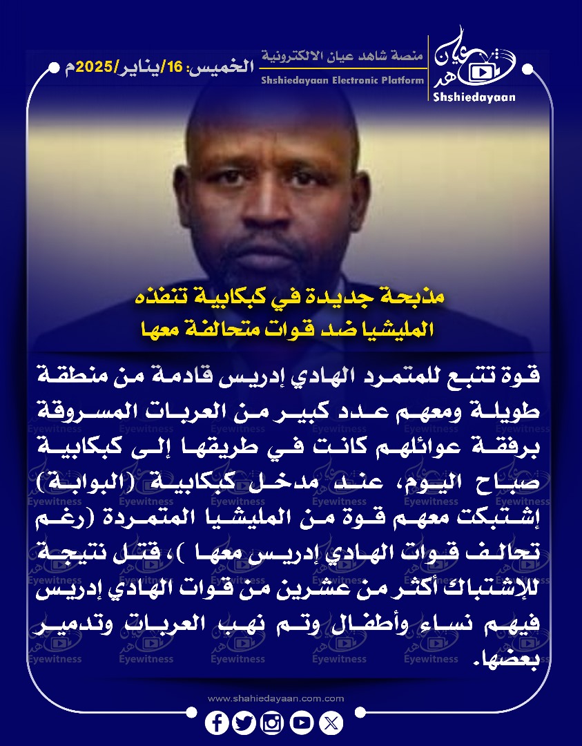 خبر في صورة الأخبار مذبحة جديدة في كبكابية تنفذه المليشيا ضد قوات متحالفة معها شاهد عيان يناير 16, 2025 0 أقرأ المزيد ..