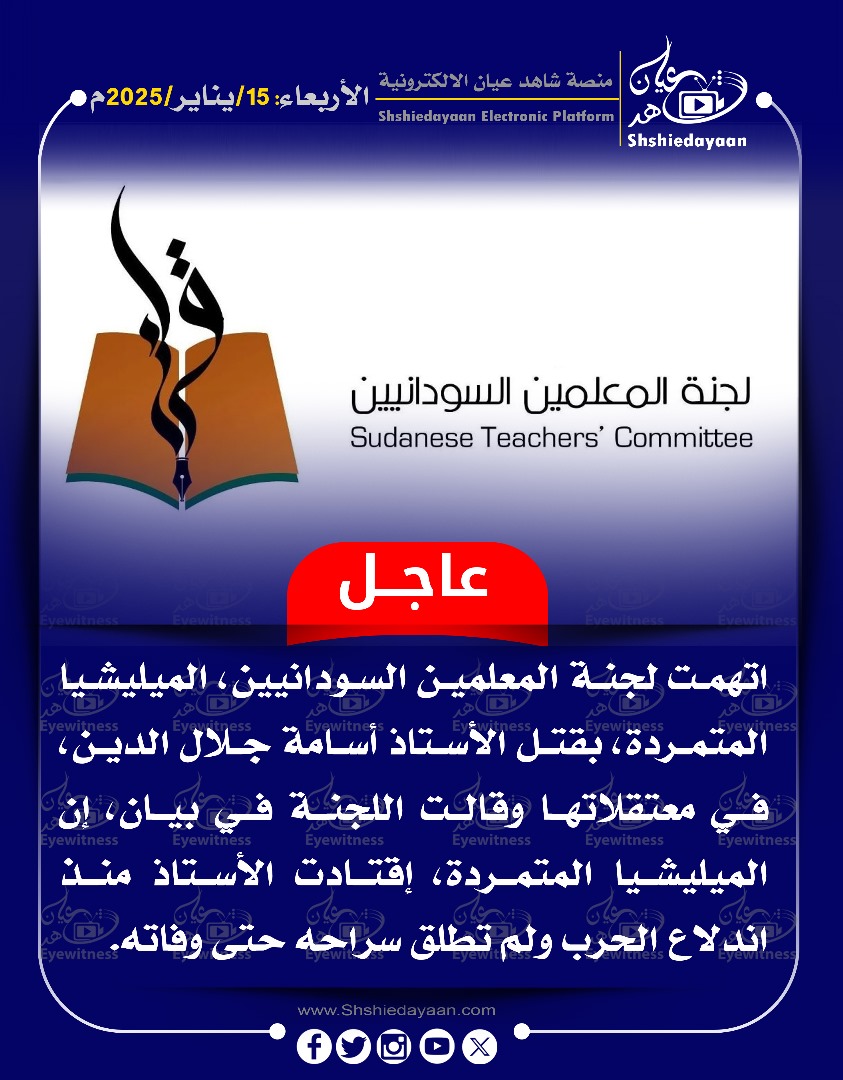خبر في صورة عاجل…..اتهمت لجنة المعلمين السودانيين، الميليشيا المتمردة، بقتل الأستاذ أسامة جلال الدين شاهد عيان يناير 15, 2025 0 أقرأ المزيد ..