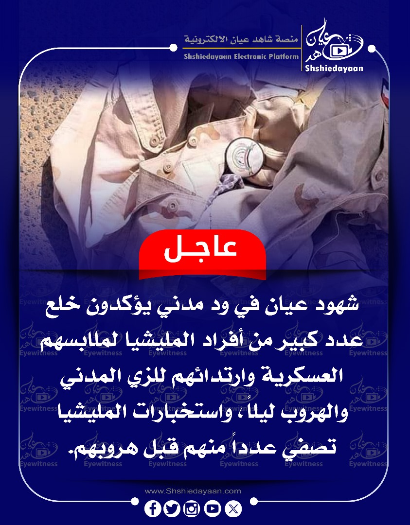 خبر في صورة عاجل…..شهود عيان في ود مدني يؤكدون خلع عدد كبير من أفراد المليشيا لملابسهم العسكرية وارتدائهم للزي المدني شاهد عيان يناير 15, 2025 0 أقرأ المزيد ..