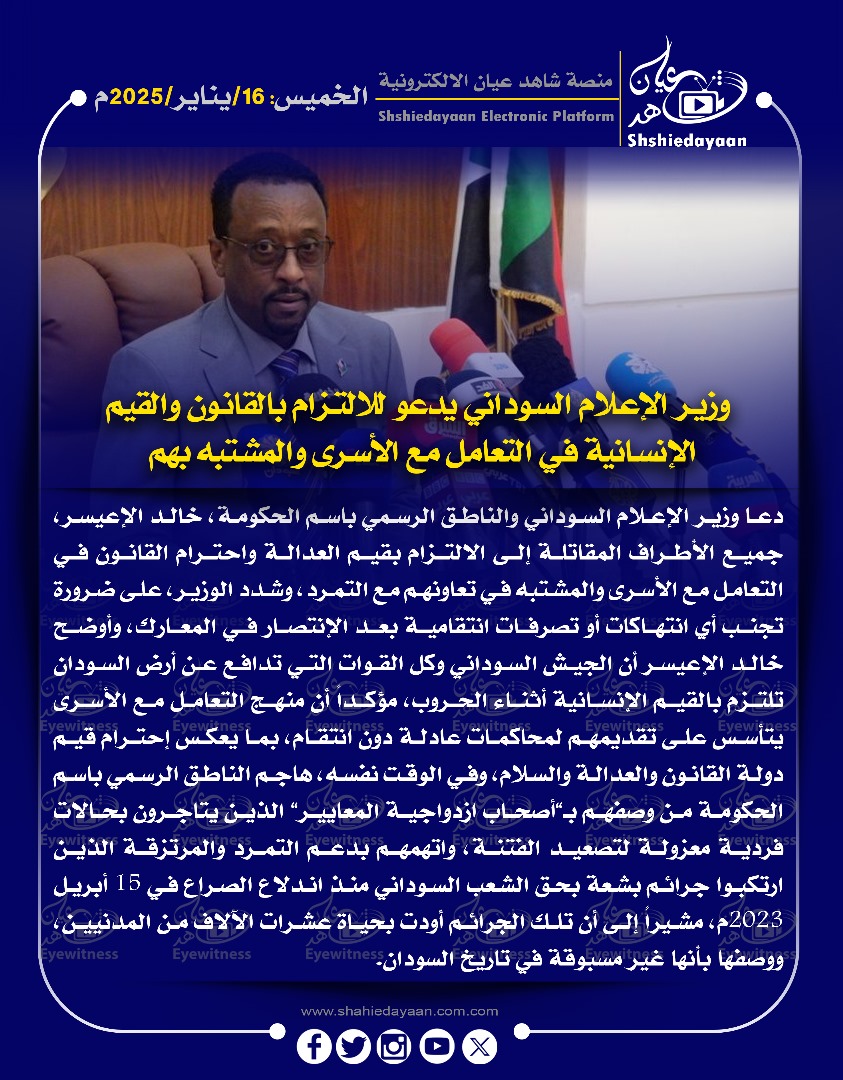 خبر في صورة الأخبار وزير الإعلام السوداني يدعو للالتزام بالقانون والقيم الإنسانية في التعامل مع الأسرى والمشتبه بهم شاهد عيان يناير 16, 2025 0 أقرأ المزيد ..