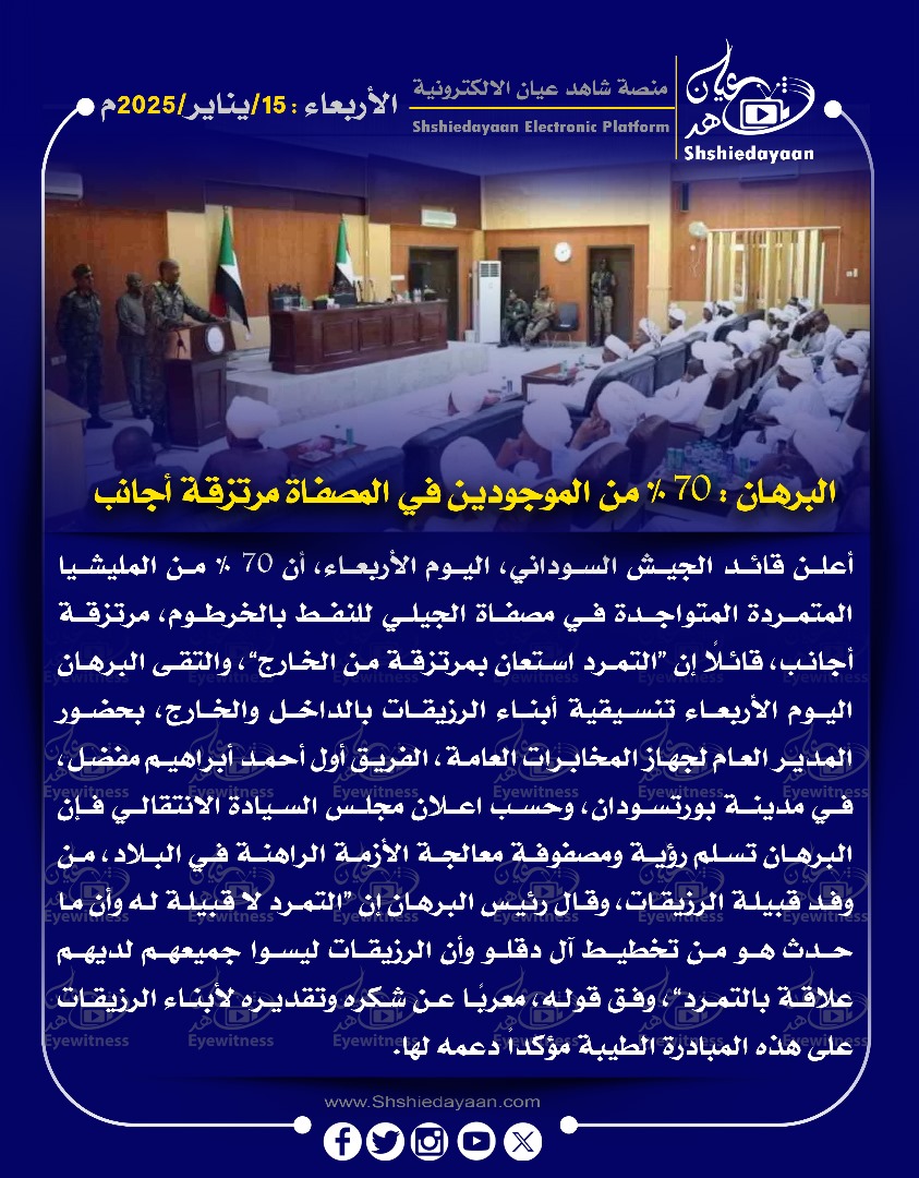 خبر في صورة البرهان : 70 % من الموجودين في المصفاة مرتزقة أجانب شاهد عيان يناير 15, 2025 0 أقرأ المزيد ..
