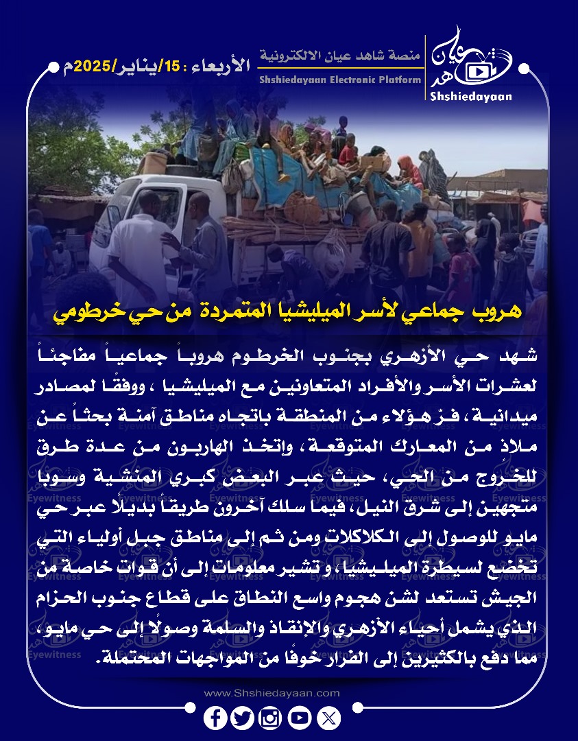 خبر في صورة هروب جماعي لأسر الميليشيا المتمردة من حي خرطومي شاهد عيان يناير 15, 2025 0 أقرأ المزيد ..