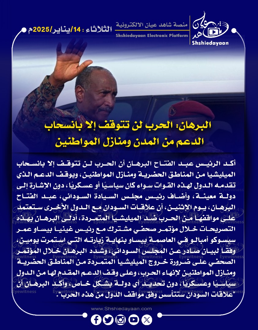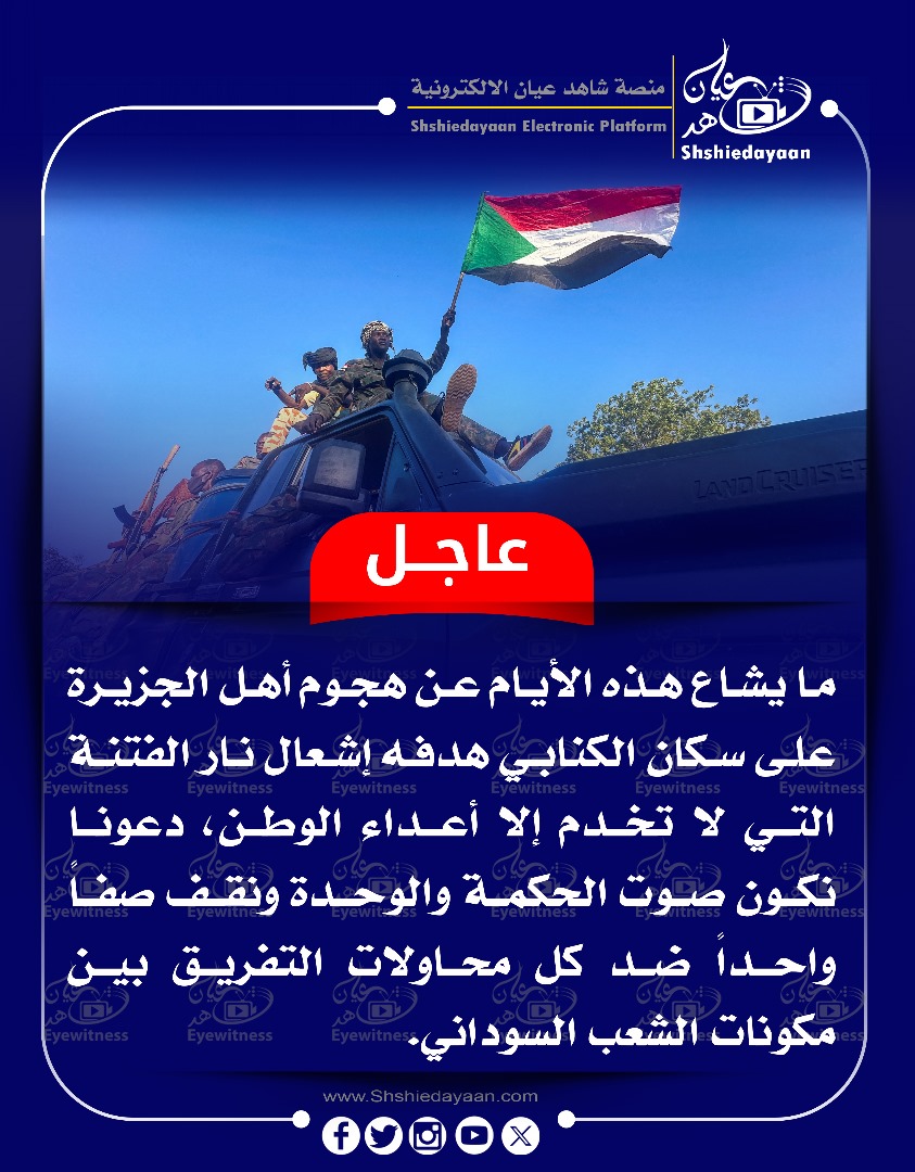 خبر في صورة عاجل … ما يشاع هذه الأيام عن هجوم أهل الجزيرة على سكان الكتابي هدفه إشعال نار الفتنة شاهد عيان يناير 14, 2025 0 أقرأ المزيد ..