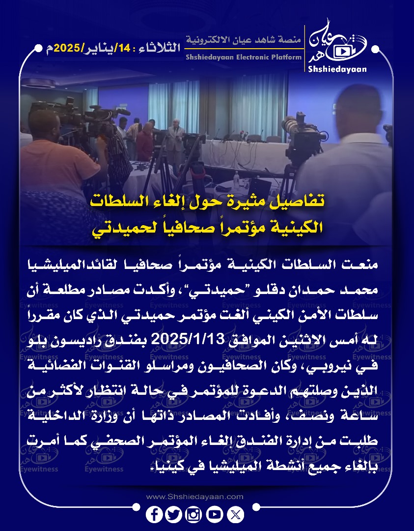 خبر في صورة تفاصيل مثيرة حول إلغاء السلطات الكينية مؤتمرا صحافيا لحميدتي شاهد عيان يناير 14, 2025 0 أقرأ المزيد ..