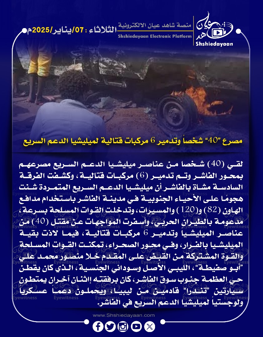 خبر في صورة مصرع 40 شخصا وتدمير 6 مركبات قتالية لميليشيا الدعم السريع شاهد عيان يناير 7, 2025 0 أقرأ المزيد ..