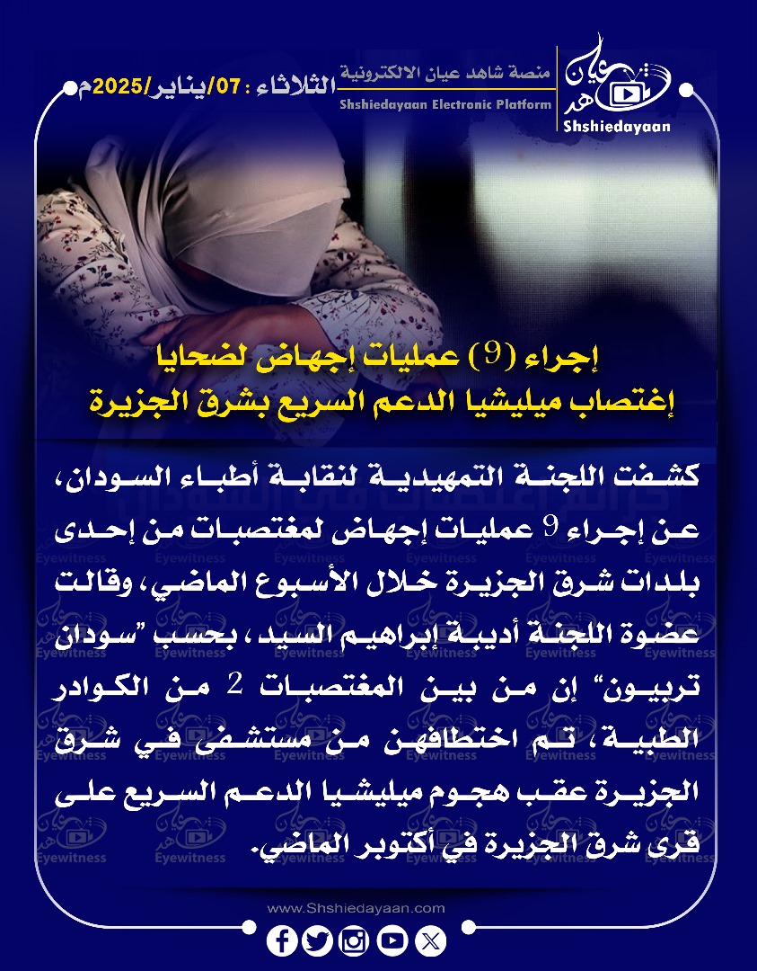 خبر في صورة إجراء (9) عمليات إجهاض لضحايا إغتصاب ميليشيا الدعم السريع بشرق الجزيرة شاهد عيان يناير 7, 2025 0 أقرأ المزيد ..