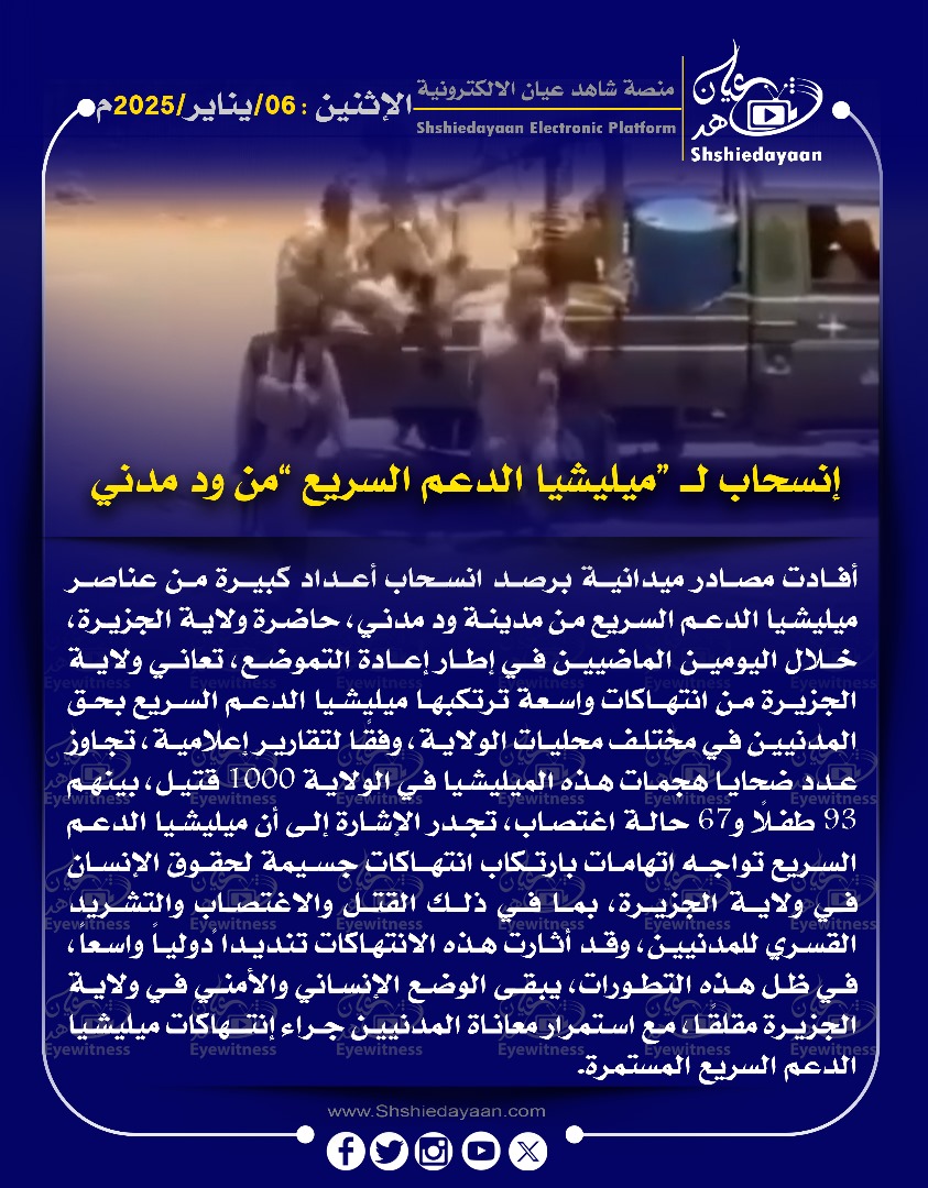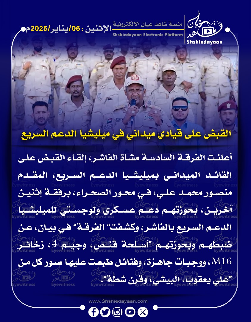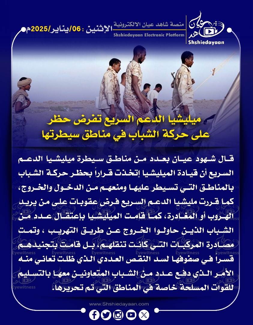خبر في صورة مليشيا الدعم السريع تفرض حظر على حركة الشباب في مناطق سيطرتها شاهد عيان يناير 6, 2025 0 أقرأ المزيد ..