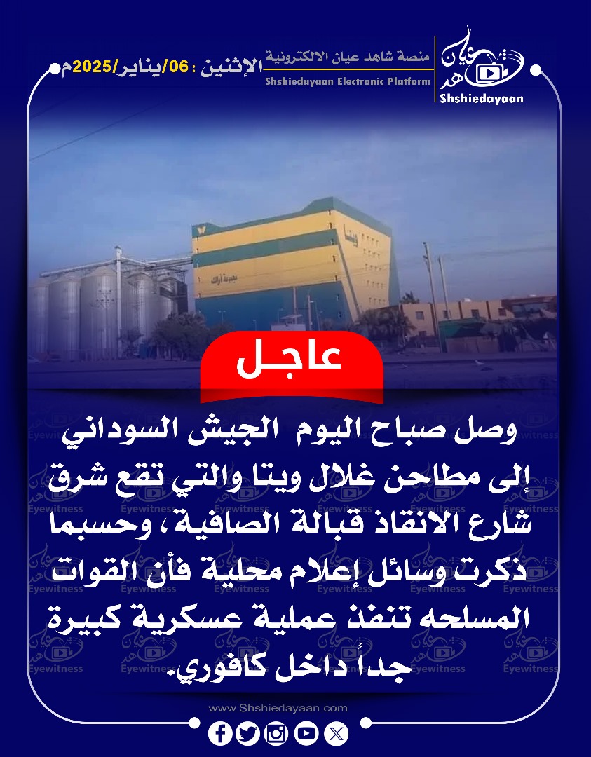 خبر في صورة عاجل …. وصل صباح اليوم الجيش السوداني إلى مطاحن غلال ويتا والتي تقع شرق شارع الانقاذ قبالة الصافية شاهد عيان يناير 6, 2025 0 أقرأ المزيد ..