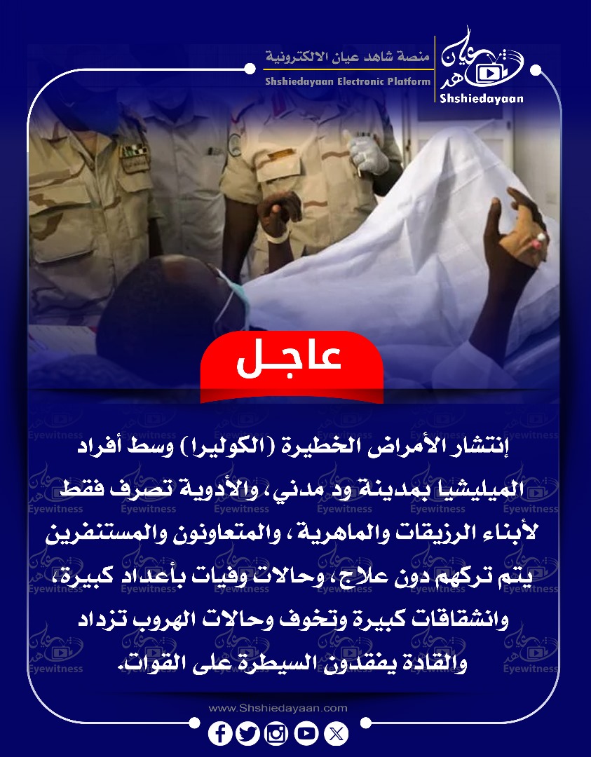 خبر في صورة الأخبار إنتشار الأمراض الخطيرة (الكوليرا) وسط أفراد الميليشيا بمدينة ود مدني شاهد عيان يناير 7, 2025 0 أقرأ المزيد ..