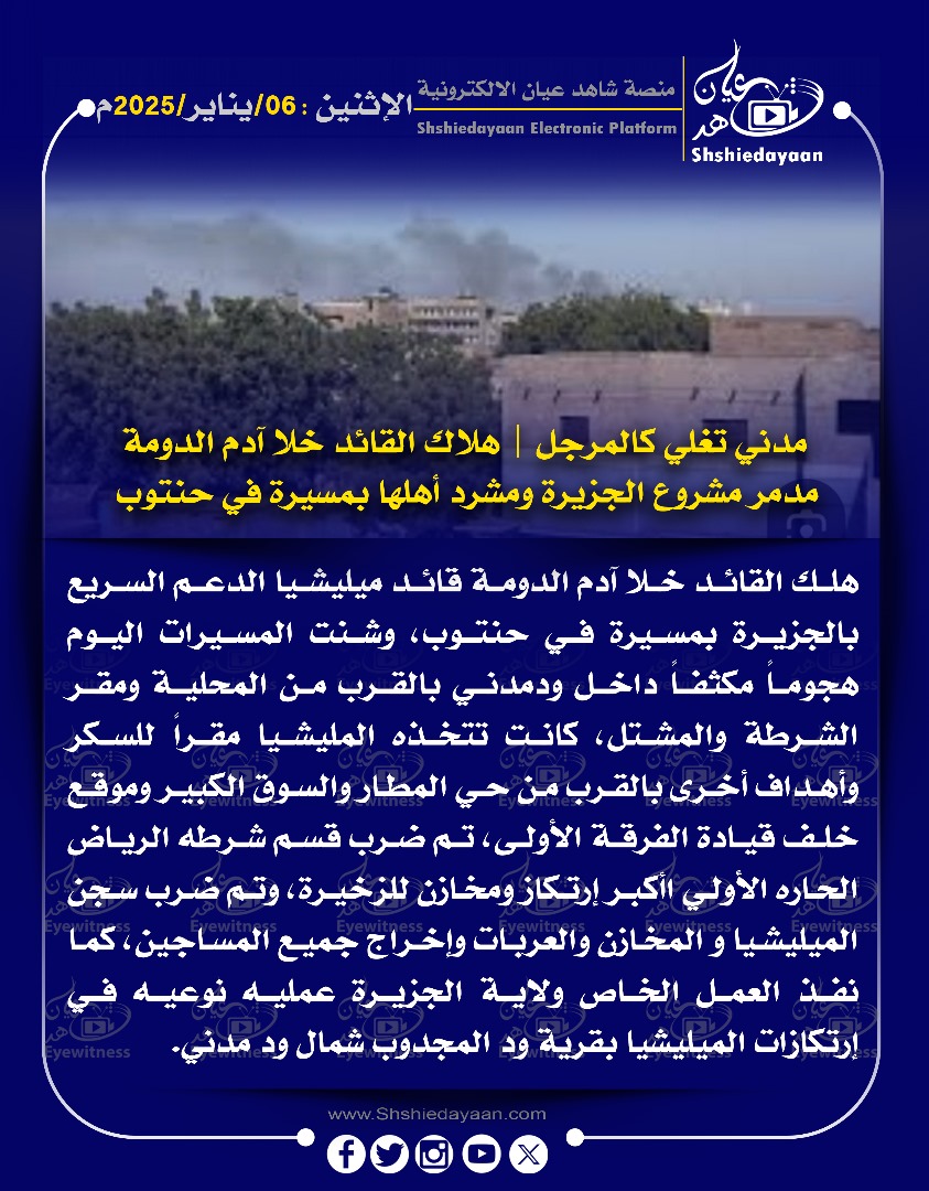 خبر في صورة مدني تغلى كالمرجل | هلاك القائد خلا آدم الدومة مدمر مشروع الجزيرة ومشرد أهلها بمسيرة في حنتوب شاهد عيان يناير 6, 2025 0 أقرأ المزيد ..