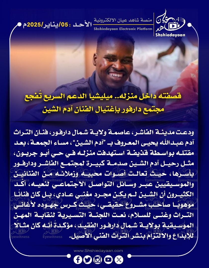 خبر في صورة قصفته داخل منزله.. ميليشيا الدعم السريع تفجع مجتمع دارفور بإغتيال الفنان آدم الشين شاهد عيان يناير 5, 2025 0 أقرأ المزيد ..