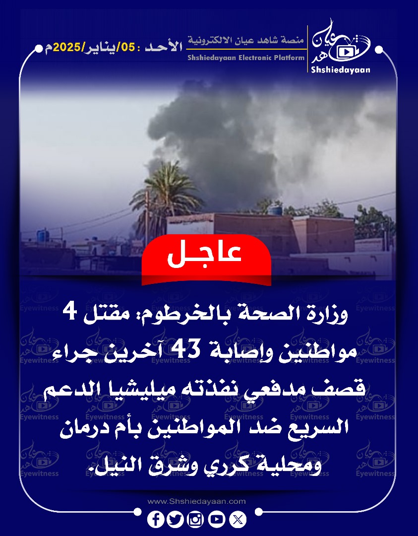 خبر في صورة الأخبار وزارة الصحة بالخرطوم: مقتل 4 مواطنين وإصابة 43 آخرينجراء قصف مدفعي شاهد عيان يناير 5, 2025 0 أقرأ المزيد ..