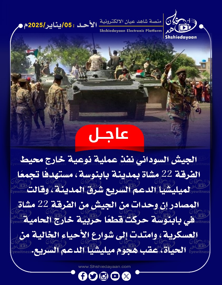 خبر في صورة الأخبار عاجل … الجيش السوداني نفذ عملية نوعية خارج محيط الفرقة 22 مشاة بمدينة بابنوسة ، شاهد عيان يناير 5, 2025 0 أقرأ المزيد ..