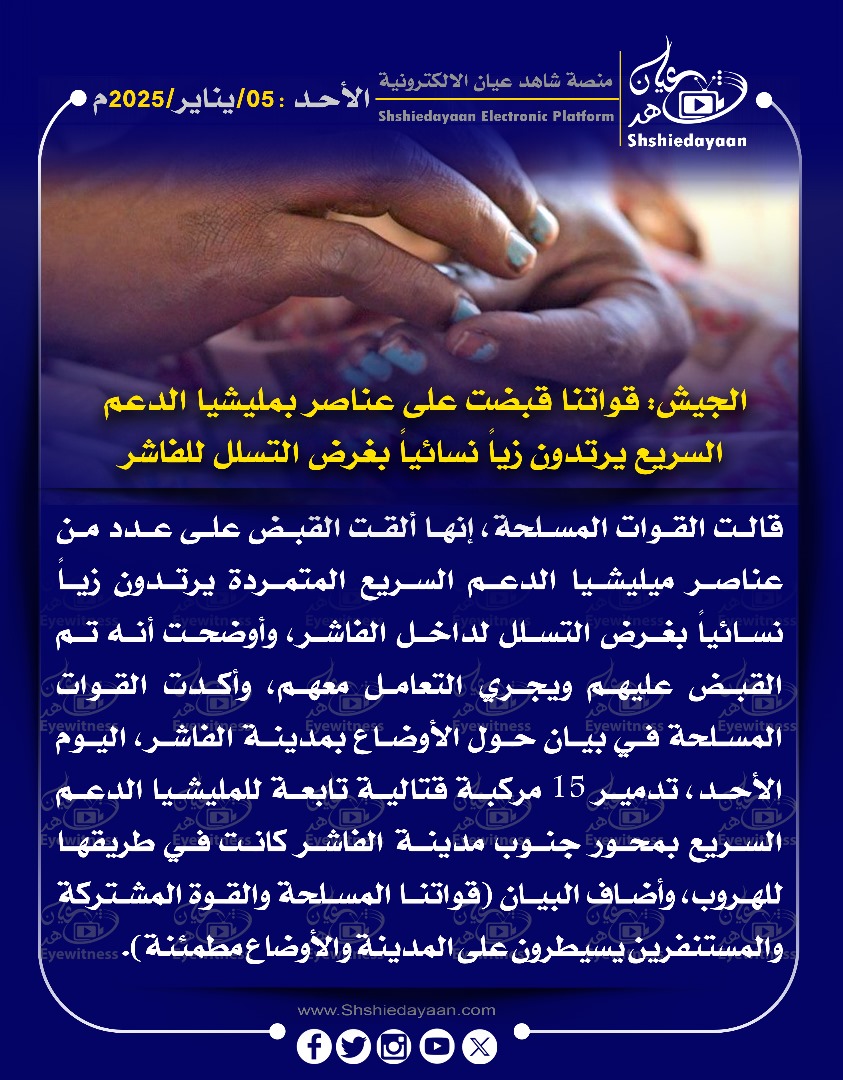 خبر في صورة الأخبار الجيش: قواتنا قبضت على عناصر بمليشيا الدعم السريع يرتدون زيا نسائيا بغرض التسلل للفاشر شاهد عيان يناير 5, 2025 0 أقرأ المزيد ..