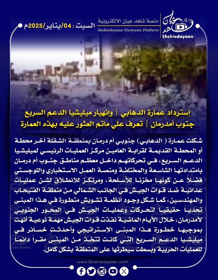 خبر في صورة إسترداد عمارة الدهابي | وإنهيار ميليشيا الدعم السريع جنوب أمدرمان | تعرف علي ماتم العثور عليه بهذه العمارة شاهد عيان يناير 4, 2025 0 أقرأ المزيد ..