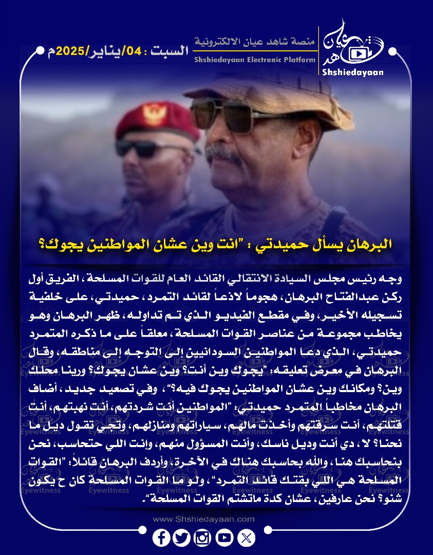 خبر في صورة البرهان يسأل حميدتي : انت وين عشان المواطنين يجوك؟ شاهد عيان يناير 4, 2025 0 أقرأ المزيد ..