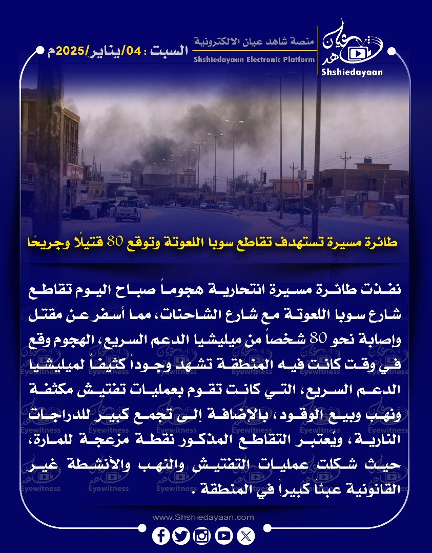 خبر في صورة طائرة مسيرة تستهدف تقاطع سوبا اللعوتة وتوقع 80 قتيلا وجريحا شاهد عيان يناير 4, 2025 0 أقرأ المزيد ..