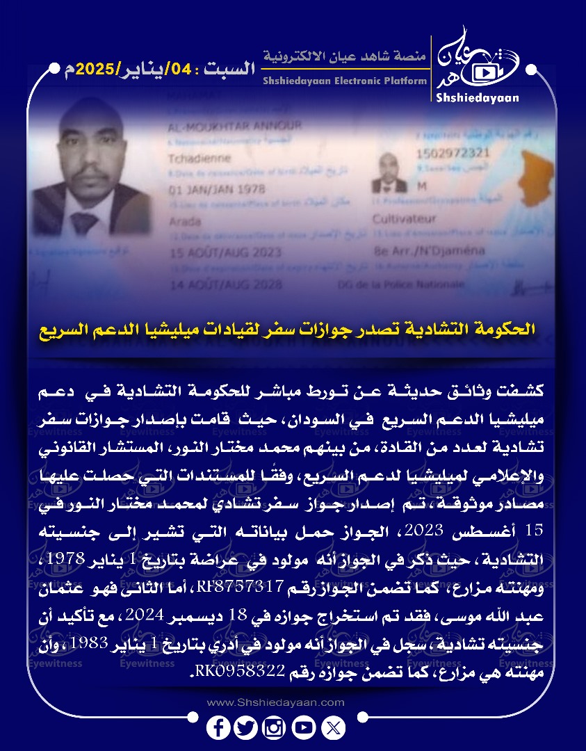 خبر في صورة الحكومة التشادية تصدر جوازات سفر لقيادات ميليشيا الدعم السريع شاهد عيان يناير 4, 2025 0 أقرأ المزيد ..