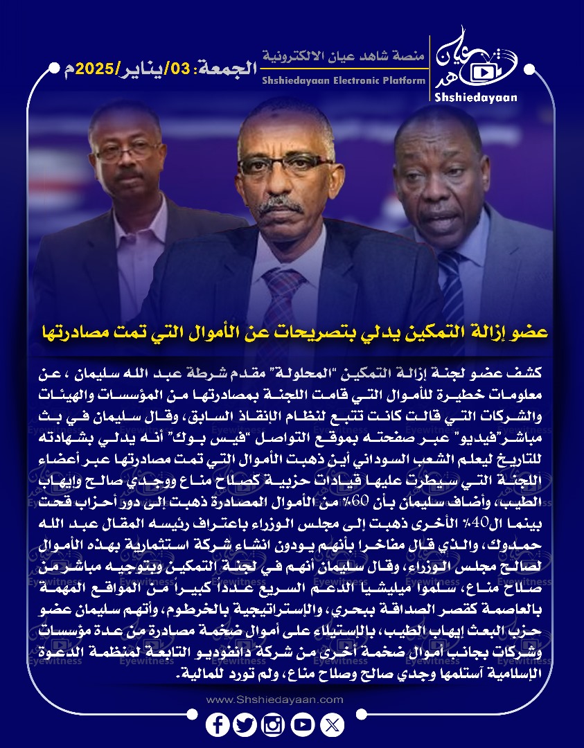 خبر في صورة عضو إزالة التمكين يدلي بتصريحات عن الأموال التي تمت مصادرتها شاهد عيان يناير 3, 2025 0 أقرأ المزيد ..