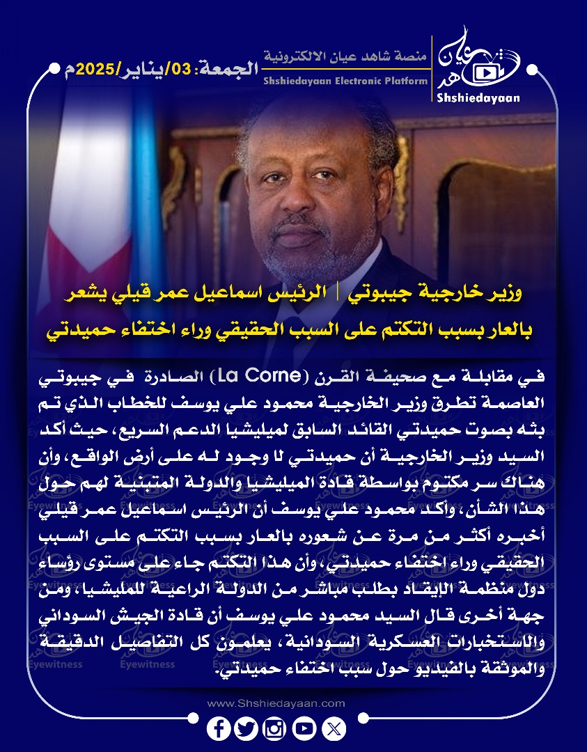 خبر في صورة وزير خارجية جيبوتي | الرئيس اسماعيل عمر قيلي يشعر بالعار بسبب التكتم على السبب الحقيقي وراء اختفاء حميدتي شاهد عيان يناير 3, 2025 0 أقرأ المزيد ..