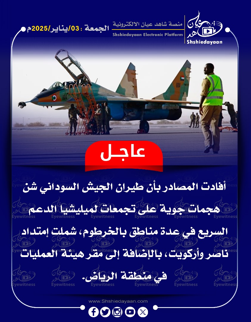 خبر في صورة عاجل … أفادت المصادر بأن طيران الجيش السوداني شن هجمات جوية على تجمعات لميليشيا الدعم السريع في عدة مناطق بالخرطوم شاهد عيان يناير 3, 2025 0 أقرأ المزيد ..