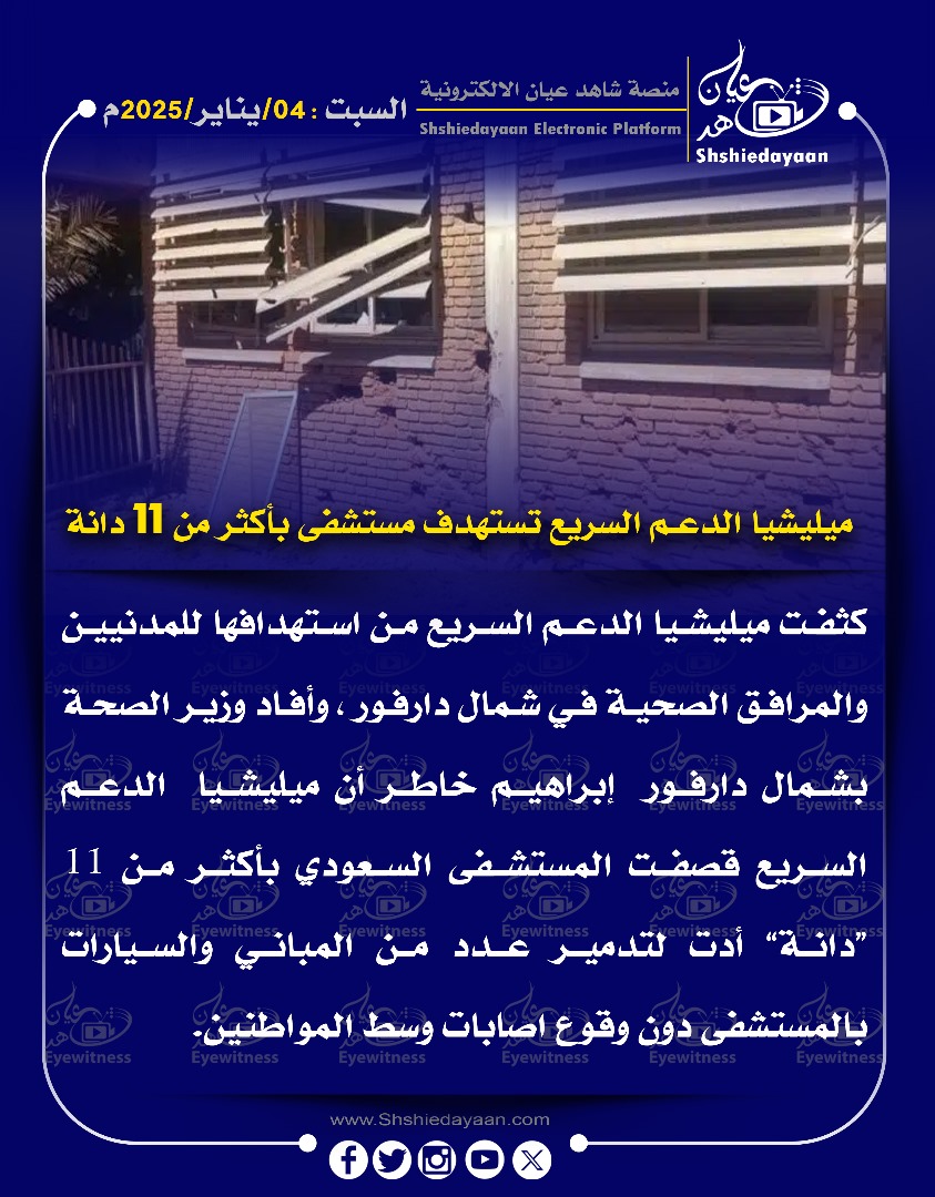 خبر في صورة ميليشيا الدعم السريع تستهدف مستشفى بأكثر من 11 دانة شاهد عيان يناير 4, 2025 0 أقرأ المزيد ..