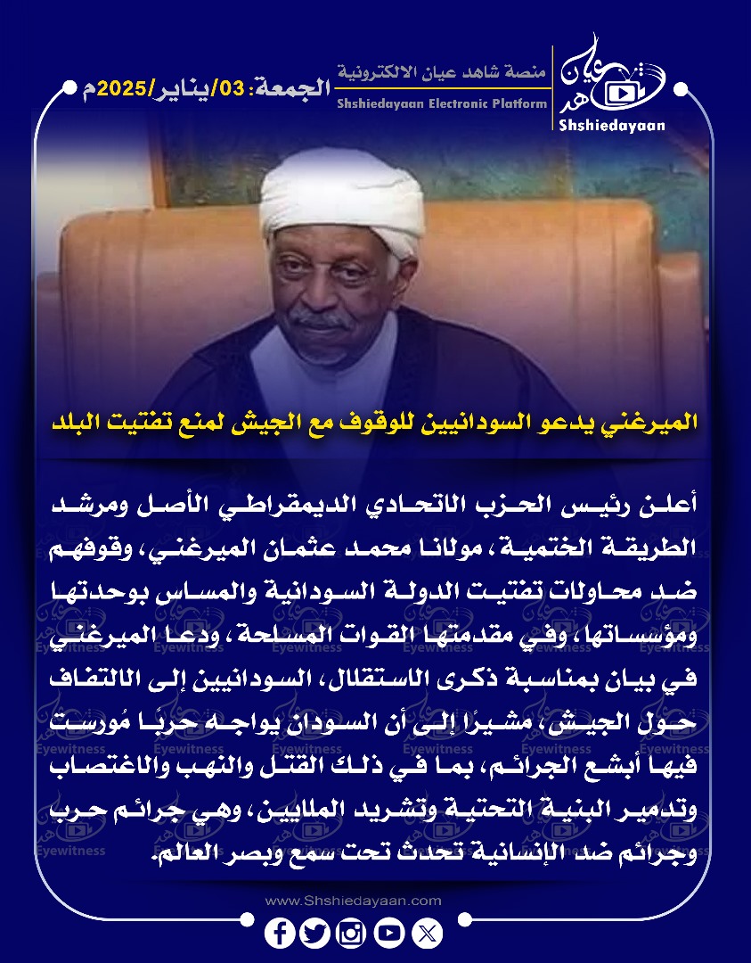 خبر في صورة الميرغني يدعو السودانيين للوقوف مع الجيش لمنع تفتيت البلد شاهد عيان يناير 3, 2025 0 أقرأ المزيد ..