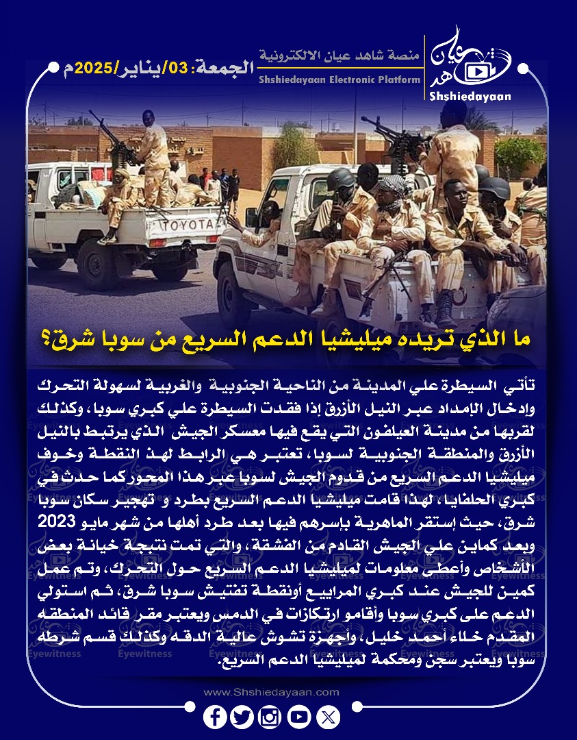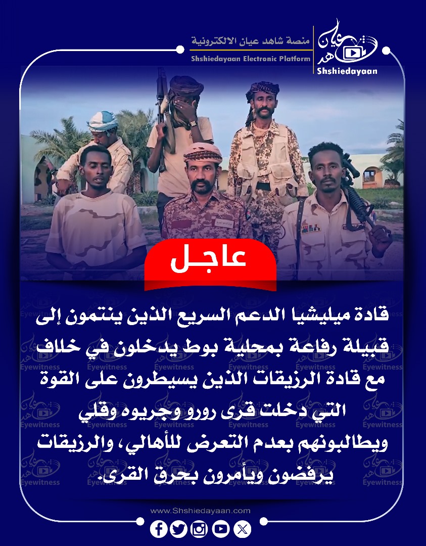 خبر في صورة عاجل……قادة ميليشيا الدعم السريع الذين ينتمون إلى قبيلة رفاعة بمحلية بوط يدخلون في خلاف . مع قادة الرزيقات الذين يسيطرون على القوة شاهد عيان يناير 3, 2025 0 أقرأ المزيد ..