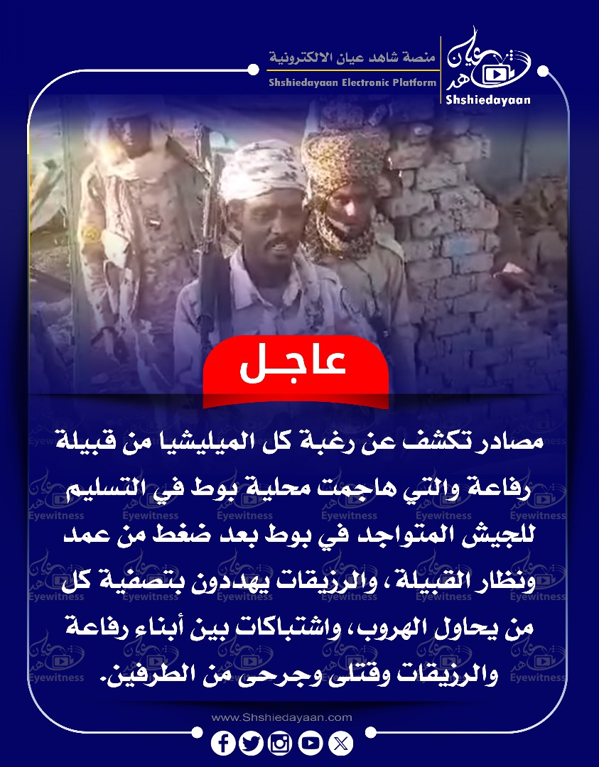 خبر في صورة عاجل…..مصادر تكشف عن رغبة كل الميليشيا من قبيلة رفاعة والتي هاجمت محلية بوط في التسليم للجيش شاهد عيان يناير 3, 2025 0 أقرأ المزيد ..