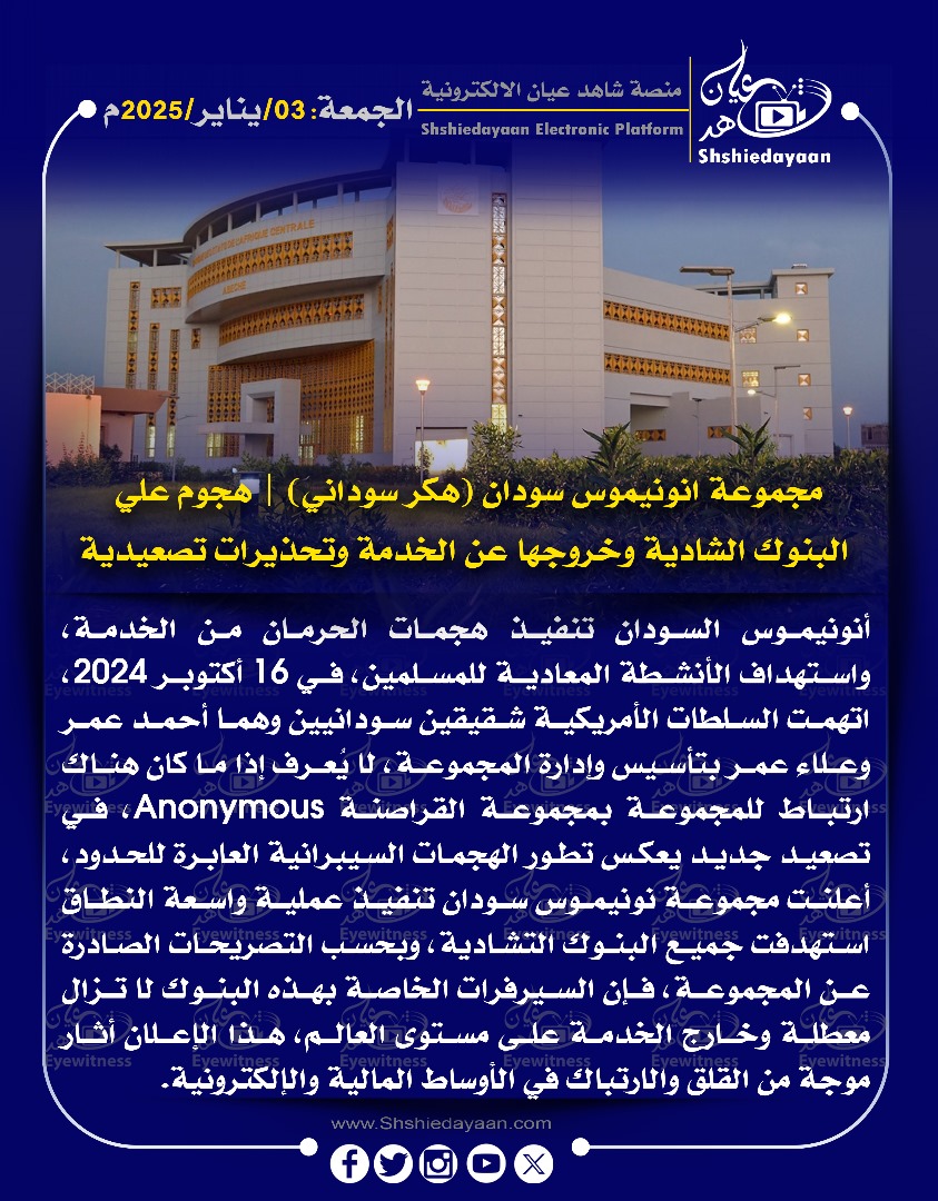 خبر في صورة مجموعة انونيموس سودان (هكر سوداني) | هجوم علي البنوك الشادية وخروجها عن الخدمة وتحذيرات تصعيدية شاهد عيان يناير 3, 2025 0 أقرأ المزيد ..