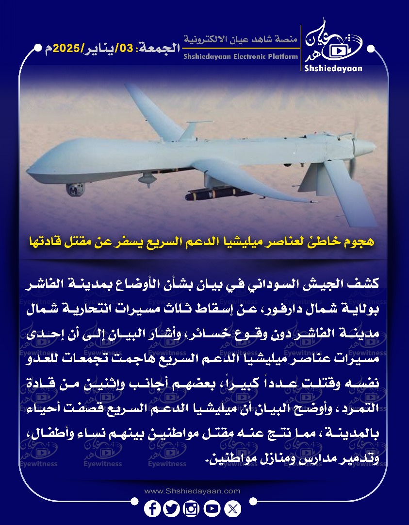 خبر في صورة هجوم خاطئ لعناصر ميليشيا الدعم السريع يسفر عن مقتل قادتها شاهد عيان يناير 3, 2025 0 أقرأ المزيد ..
