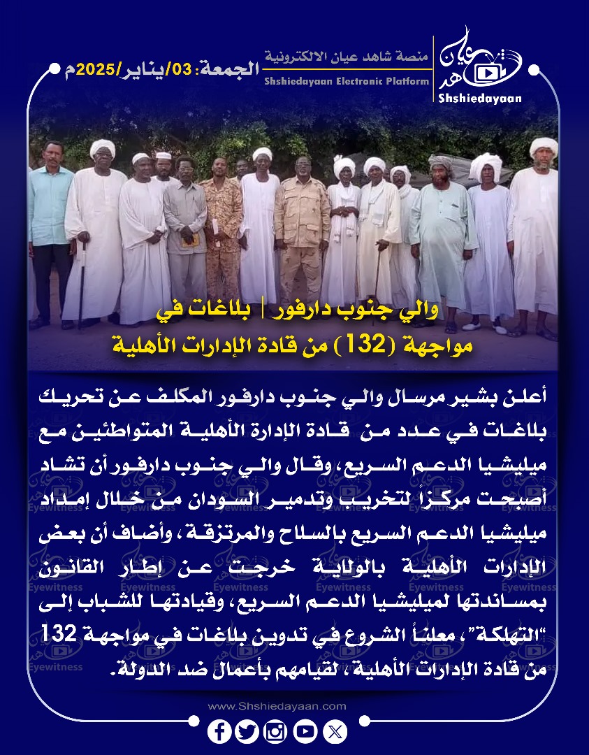 خبر في صورة والي جنوب دارفور | بلاغات في مواجهة (132) من قادة الإدارات الأهلية شاهد عيان يناير 3, 2025 0 أقرأ المزيد ..