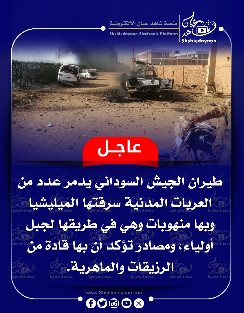 خبر في صورة عاجل …. طيران الجيش السوداني يدمر عدد من العربات المدنية سرقتها الميليشيا شاهد عيان يناير 1, 2025 0 أقرأ المزيد ..
