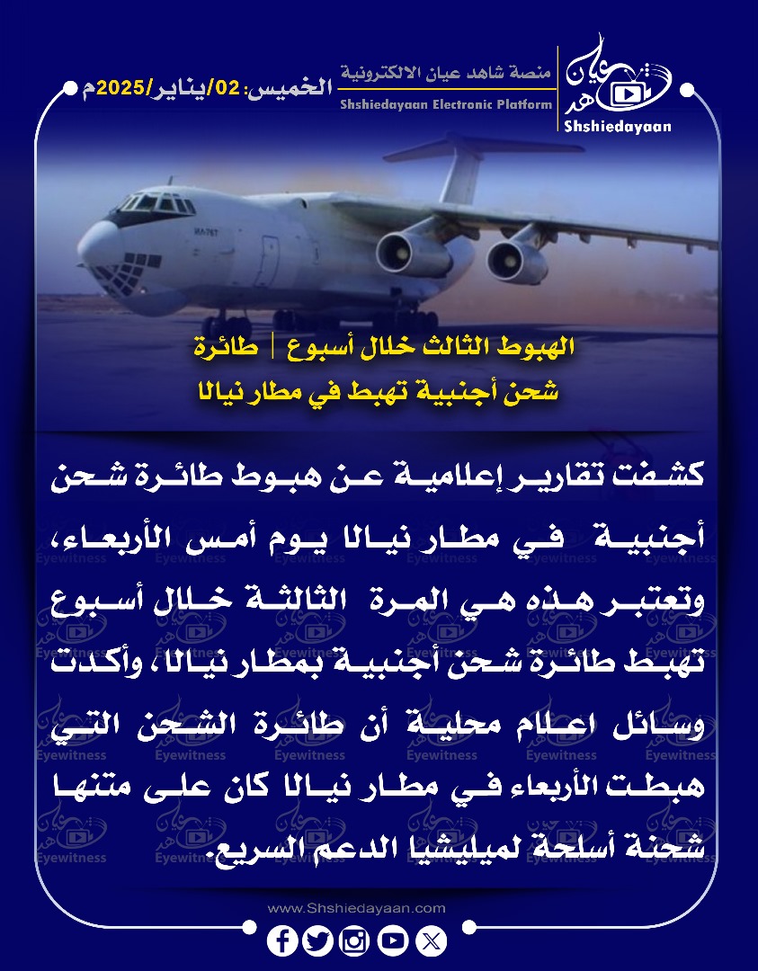 خبر في صورة الأخبار الهبوط الثالث خلال أسبوع طائرة شحن أجنبية تهبط في مطارنيال شاهد عيان يناير 2, 2025 0 أقرأ المزيد ..