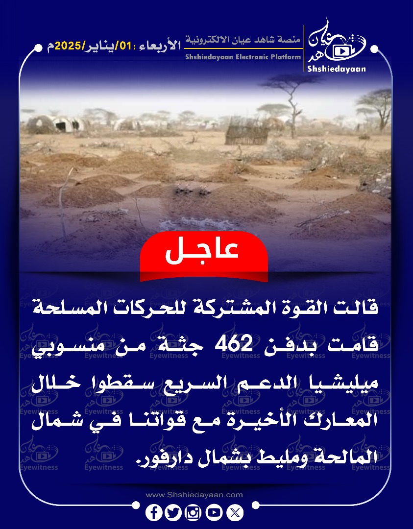 خبر في صورة عاجل……قالت القوة المشتركة للحركات المسلحة قامت بدفن 462 جثة من منسوبي ميليشيا الدعم السريع شاهد عيان يناير 1, 2025 0 أقرأ المزيد ..