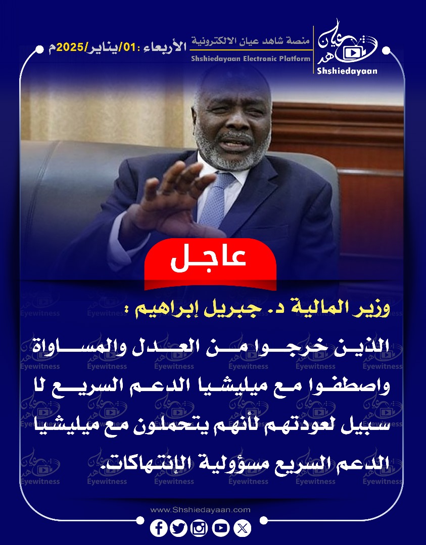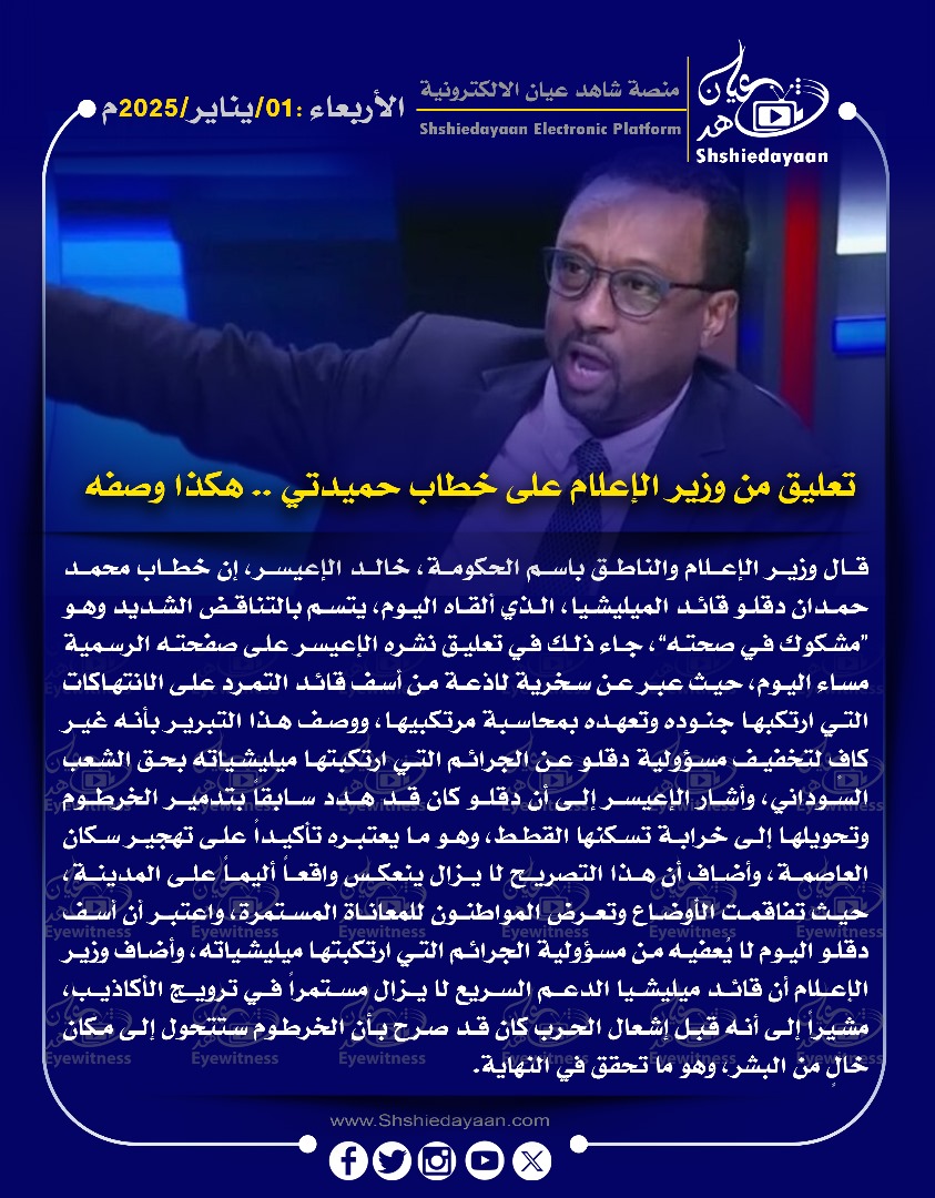 خبر في صورة تعليق من وزير الإعلام على خطاب حميدتي .. هكذا وصفه شاهد عيان يناير 1, 2025 0 أقرأ المزيد ..