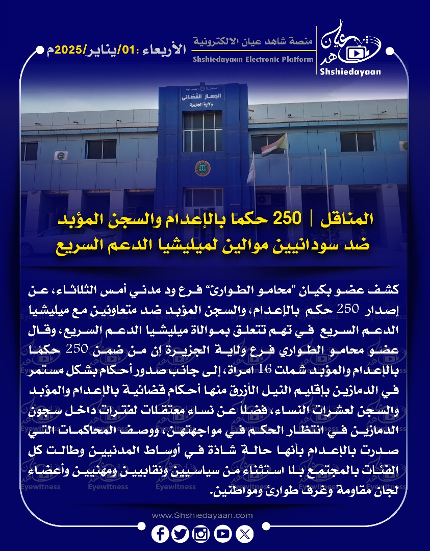 خبر في صورة المناقل | 250 حكما بالإعدام والسجن المؤبد ضد سودانيين موالين لميليشيا الدعم السريع شاهد عيان يناير 1, 2025 0 أقرأ المزيد ..